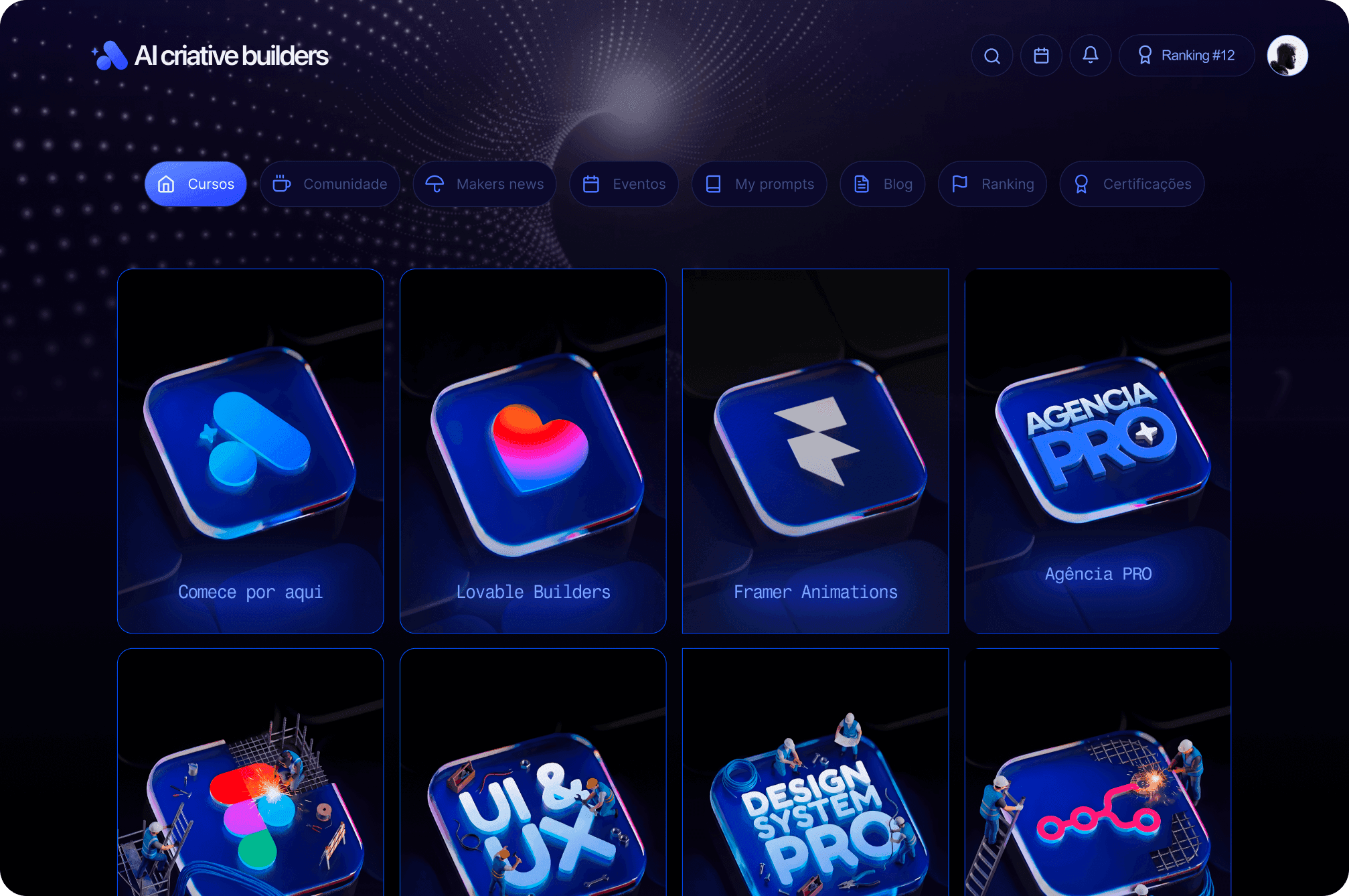 Na AI creative builders, você não apenas assiste aulas, você vive uma experiência imersiva e visualmente moderna.